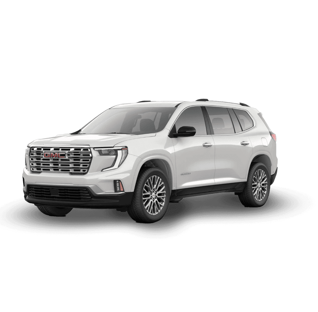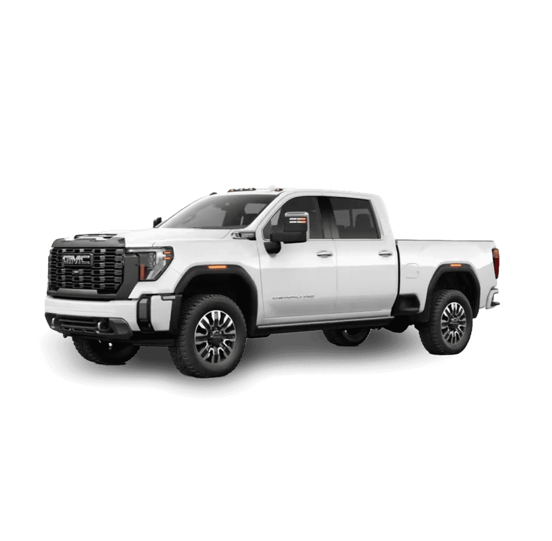 A silver GMC pickup truck is shown from the front, showcasing its bold grille, sleek headlights, and robust design. The truck has a modern appearance with black and chrome accents, emphasizing its sturdy build.